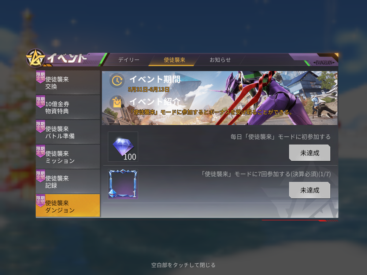 1は「使徒襲来ダンジョン」のことで、1日1回レジャーの「使徒襲来」に参加すると100ダイヤもらえます。