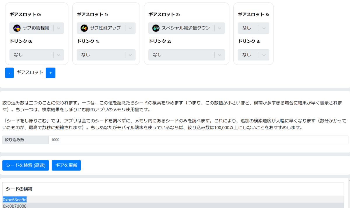 ・【誰でも100%的中】次につくギアパワーを予測し、最短で欲しいギアを作る方法【Gear Seed Checker】 | イカタイムズ を参考。