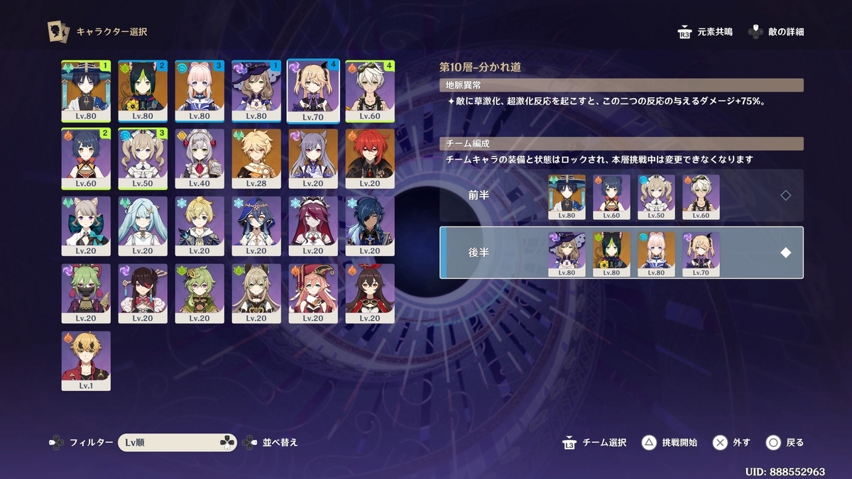 螺旋10層突破時点でLv80が4人ですが、香菱とベネットをLv6060で止めるくらいならどちらかを80にしておくべきでした。