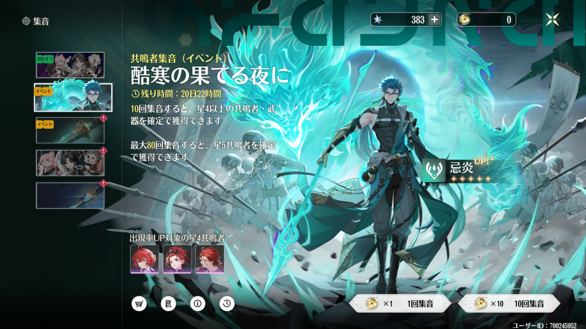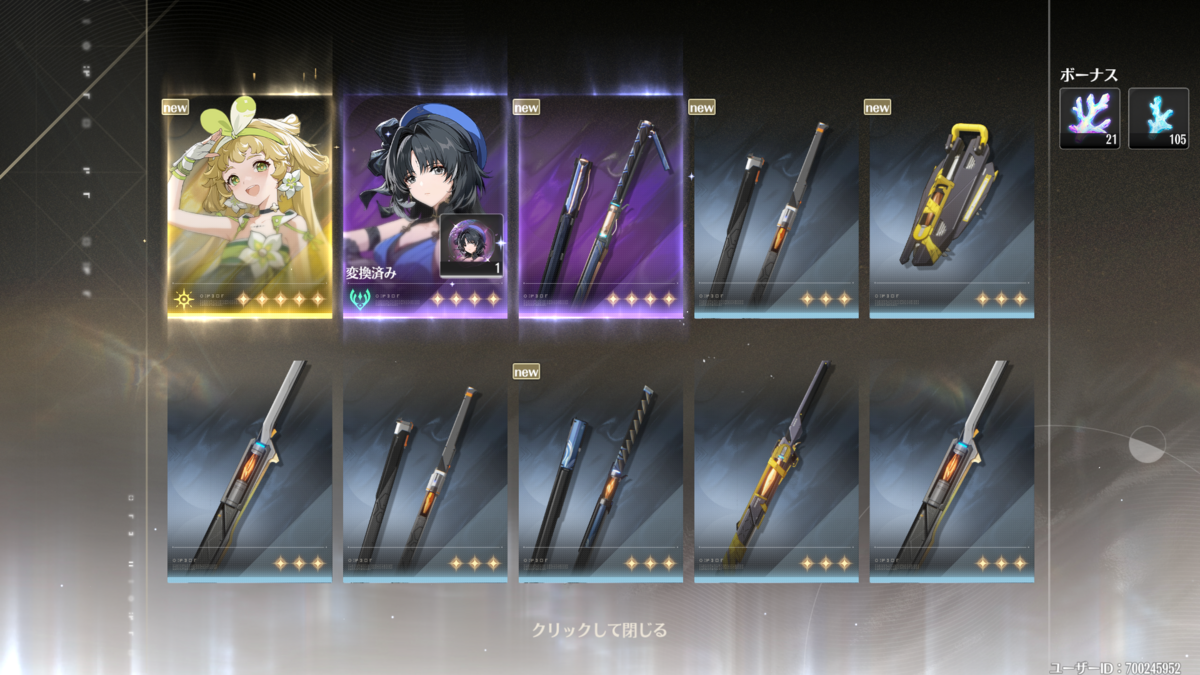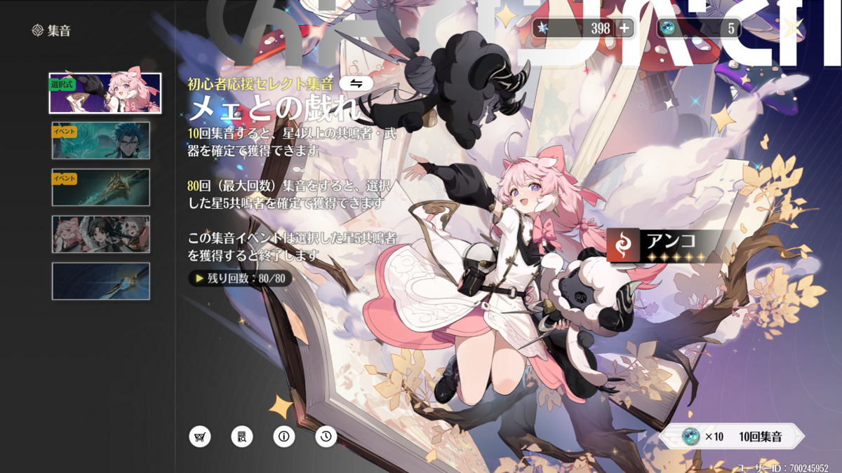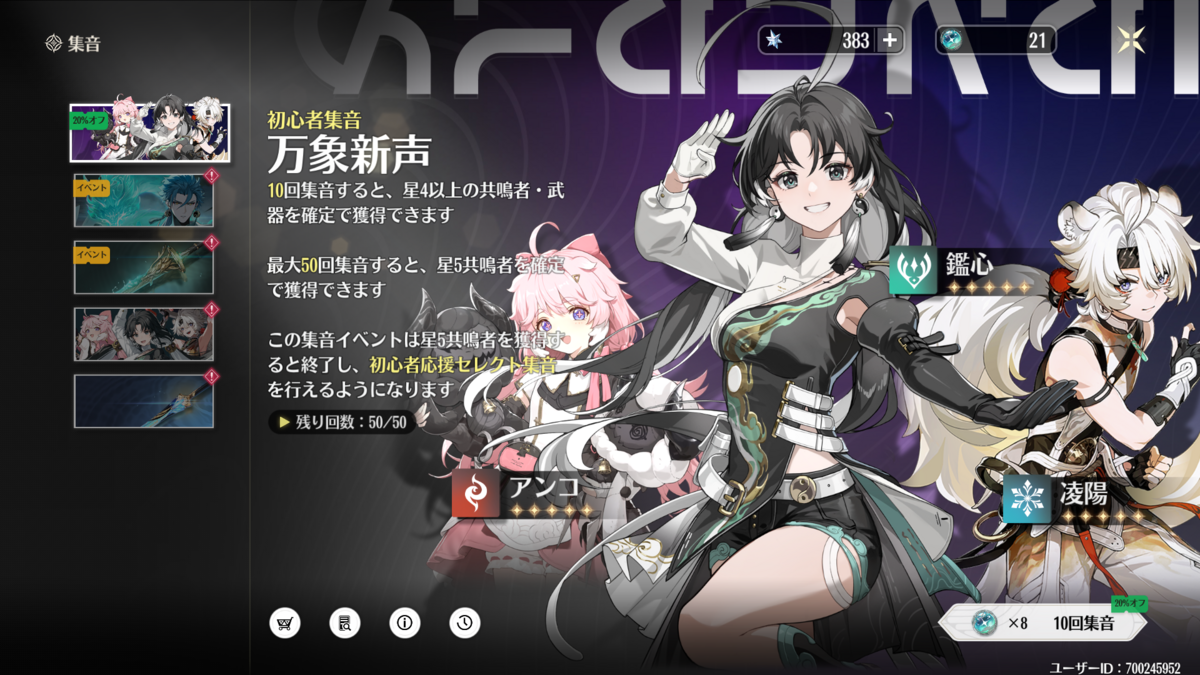 なお20連目で☆5が出ると【初心者集音 万象新声】は打ち切りらしく、初心者ガチャ第2弾が始まります!